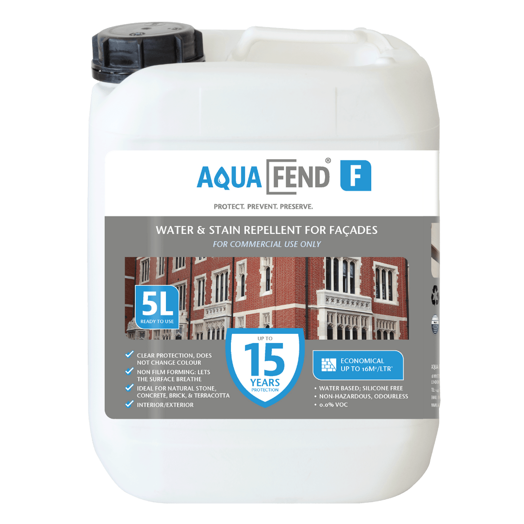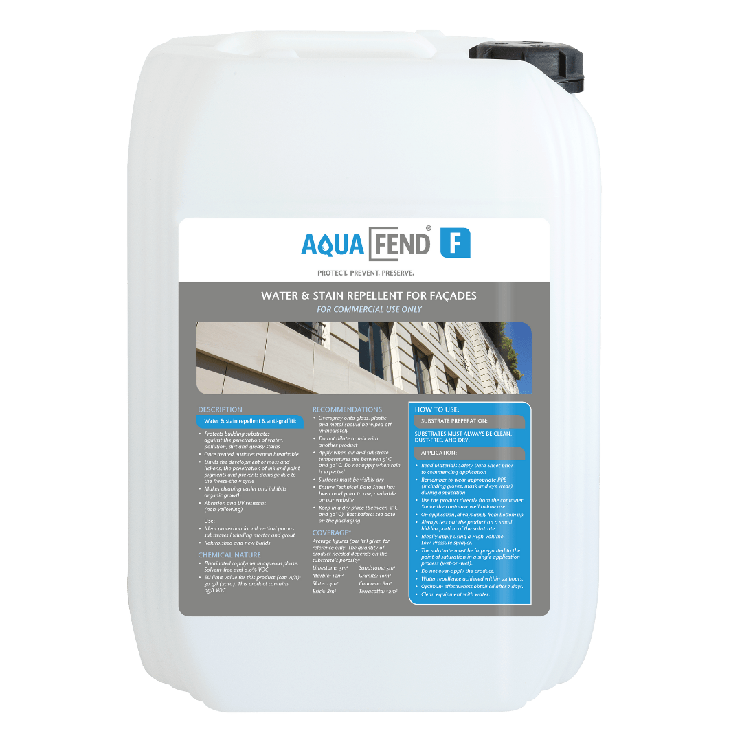 Aqua Fend® effectively protects concrete and stone surfaces, forming an impenetrable, but breathable layer increasing the length of time between cleaning, acting as a barrier to prevent water, dirt, and grime from penetrating the facade’s surface. The invisible protection of Aqua Fend® F’s long-lasting surface protection results in a facade protection which is long lasting and easy to apply. Aqua Fend® surface sealing technology results in the capillaries of the façade becoming protected, meaning that contaminants will sit on top, allowing them to be removed by basic cleaning operations.
