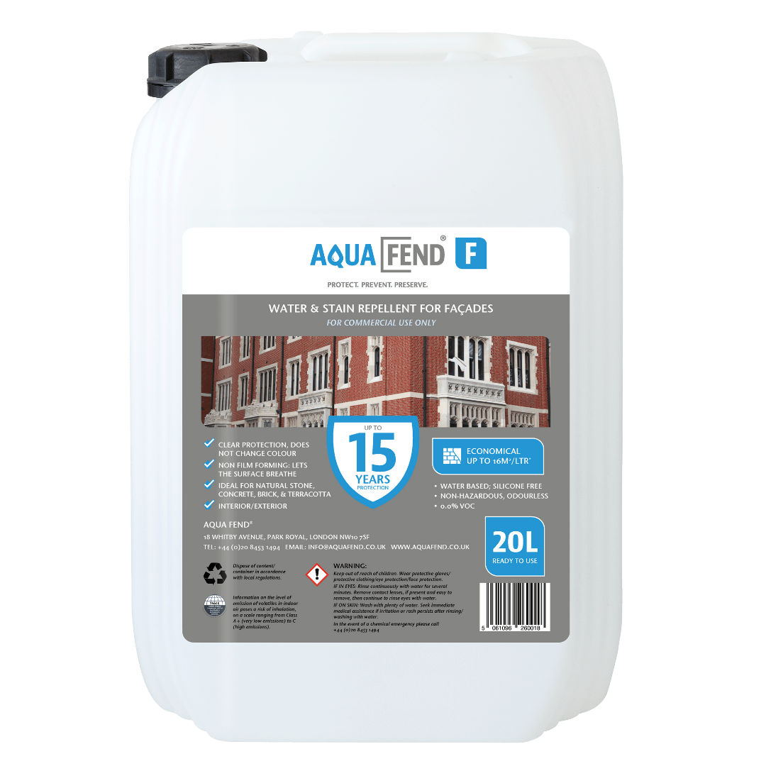 Aqua Fend® F is applied once a building’s façade has been cleaned and restored. The primary concern is to prevent the build-up of dirt particles and damp which can react with the masonry and reduce its lifespan. This commercial and heritage building protection provides a non-toxic protective coating which is water resistant, dirt and grime repellent, and offers stone protection and concrete protection for up to fifteen years.